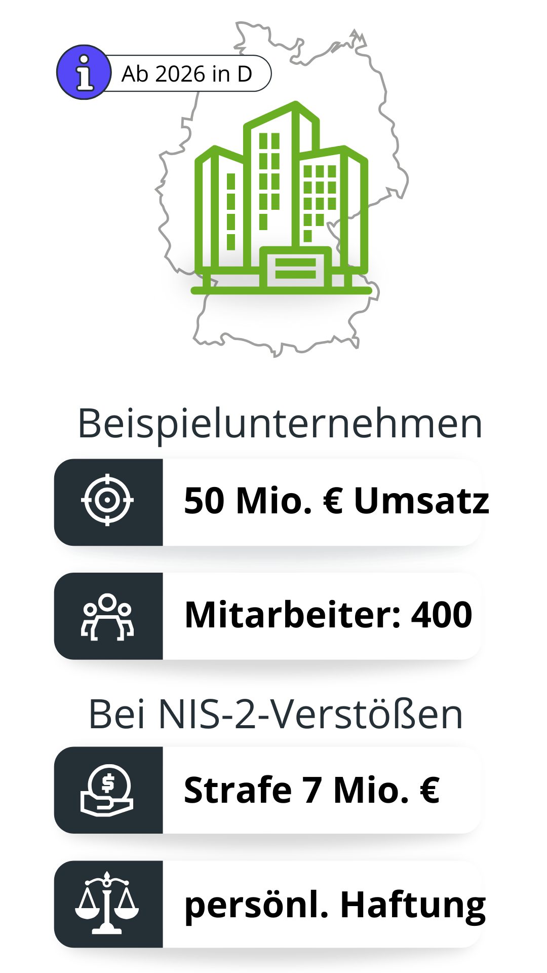 Ein mittelständisches Unternehmen mit 400 Mitarbeitenden und 50 Mio. € Umsatz riskiert als „wichtige Einrichtung“ bei NIS-2-Verstößen bis zu 7 Mio. € Bußgeld.